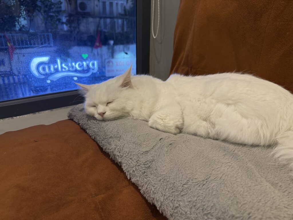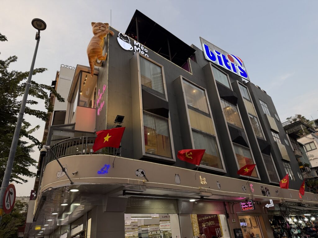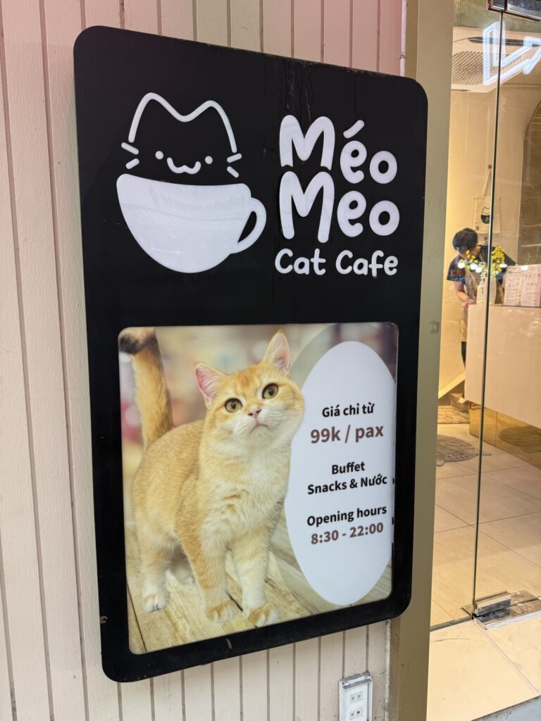 私が座ってねこを撫でていると、ベトナム人の女の子がやってきて、ねこと一緒に遊び始めました。