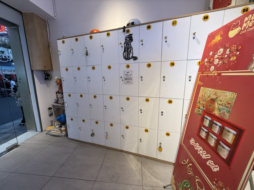 受付をしてもらったあと、このロッカーで靴を預けて、手の消毒をします。