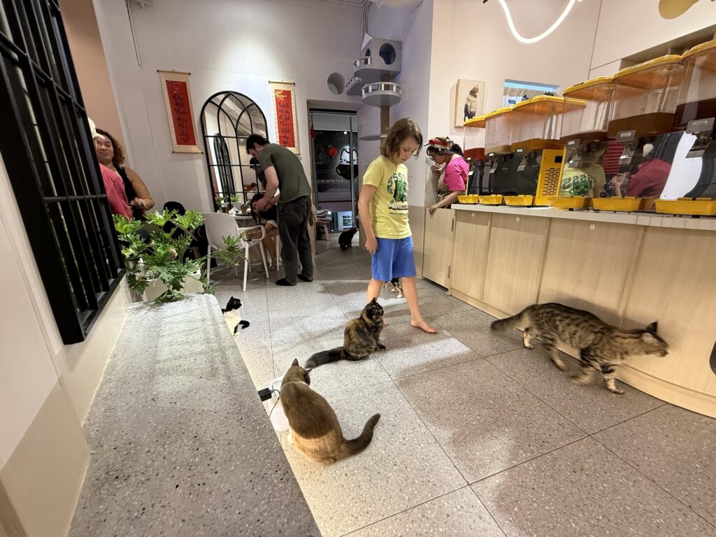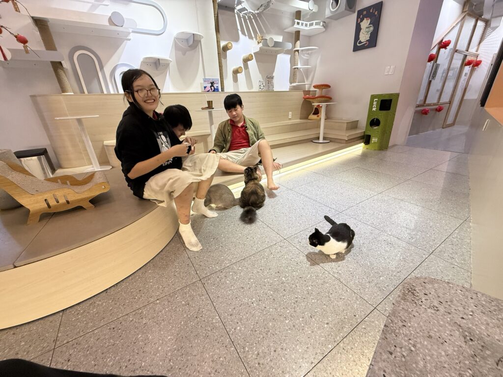 お母さんと一緒に来ている子ども達もたくさんいました。店員さんも交えて、みんなでねこを撫でながら「ねこ飼ってる?」「あの猫がかわいい」「あの子はなんていう種類?」などとねこトークに花を咲かせる、世界一平和な空間でした。