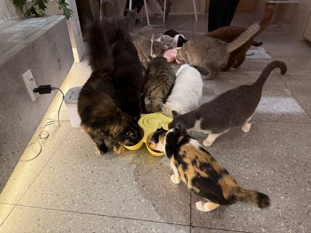 おやつを持っている人がいると、群がってくるねこたち。