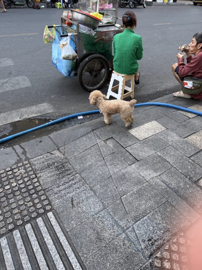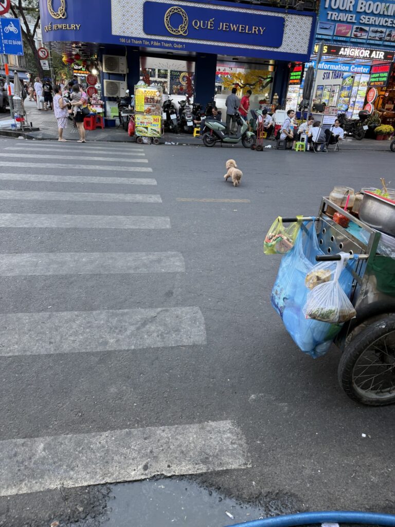 バイクがびゅんびゅん通る道を、リードのついてないわんこが一人で歩いて行く姿、とてもシュールでした。笑