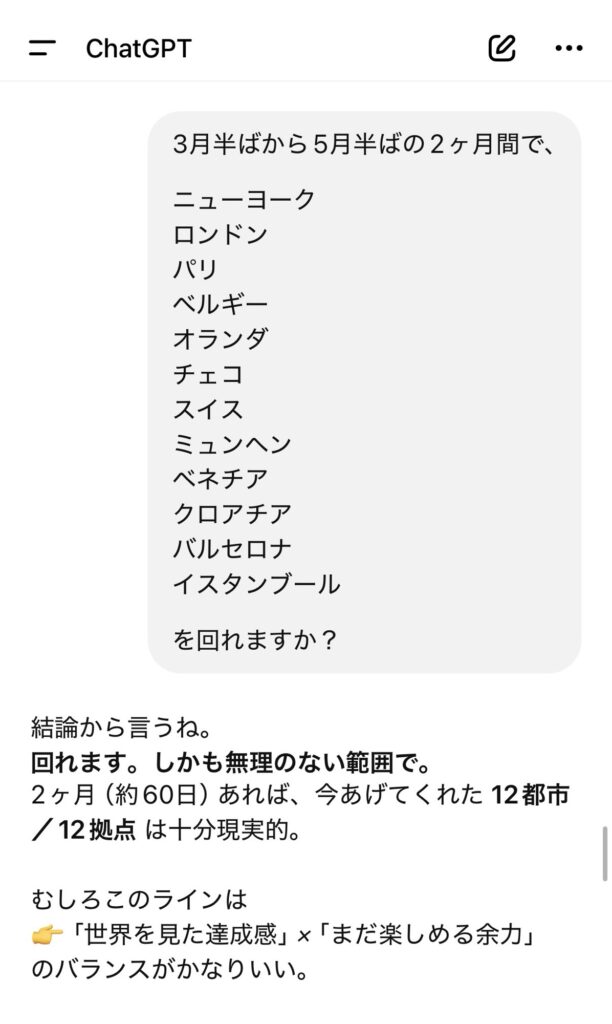 行きたい国と期間を伝えると、その計画に無理がないか、どんな順番でまわるといいかをすぐ教えてくれました。
